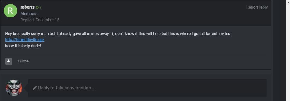 Hi everyone, I am presenting a thought after purchasing an Invite from this site. Inviter was super instantaneous to get back to me after I had questioned if he had any avai…Seller is great! Fast to respond and reliable. Had to wait but it's reasonable since seller is at work. 10/10 would buy something else again in the future.i was searching for invitation for tracker i found may sites sell these tracker some of them i did not trust them to send money some of them are expensive i was confused un…+Vouch Very Smooth Communication Bought an invite, I will be buying many more invites for sure and hopefully we can build long term relation. Recommended for sure.Fast and reliable, highly recommend.Fairness, speed, professionalism, reasonable price and especially trustworthy. I bought it from you and I will do it again. Thank you.Well, he was really fast and loved that he didn't ask much and simply sent me an invite. 😊 It was painless and prompt. Thanks a lot, man.